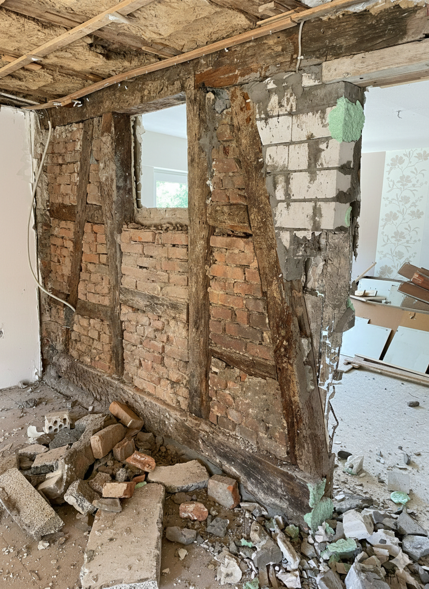 Wir demontieren alte Türen, Zargen, Einbauten, Sanitär- und Küchenbereiche sowie einfache Leitungsführungen im Innenraum. Auf Wunsch stimmen wir uns eng mit Ihren Planern oder Bauleitern ab, damit alles zum Bauablauf passt.
